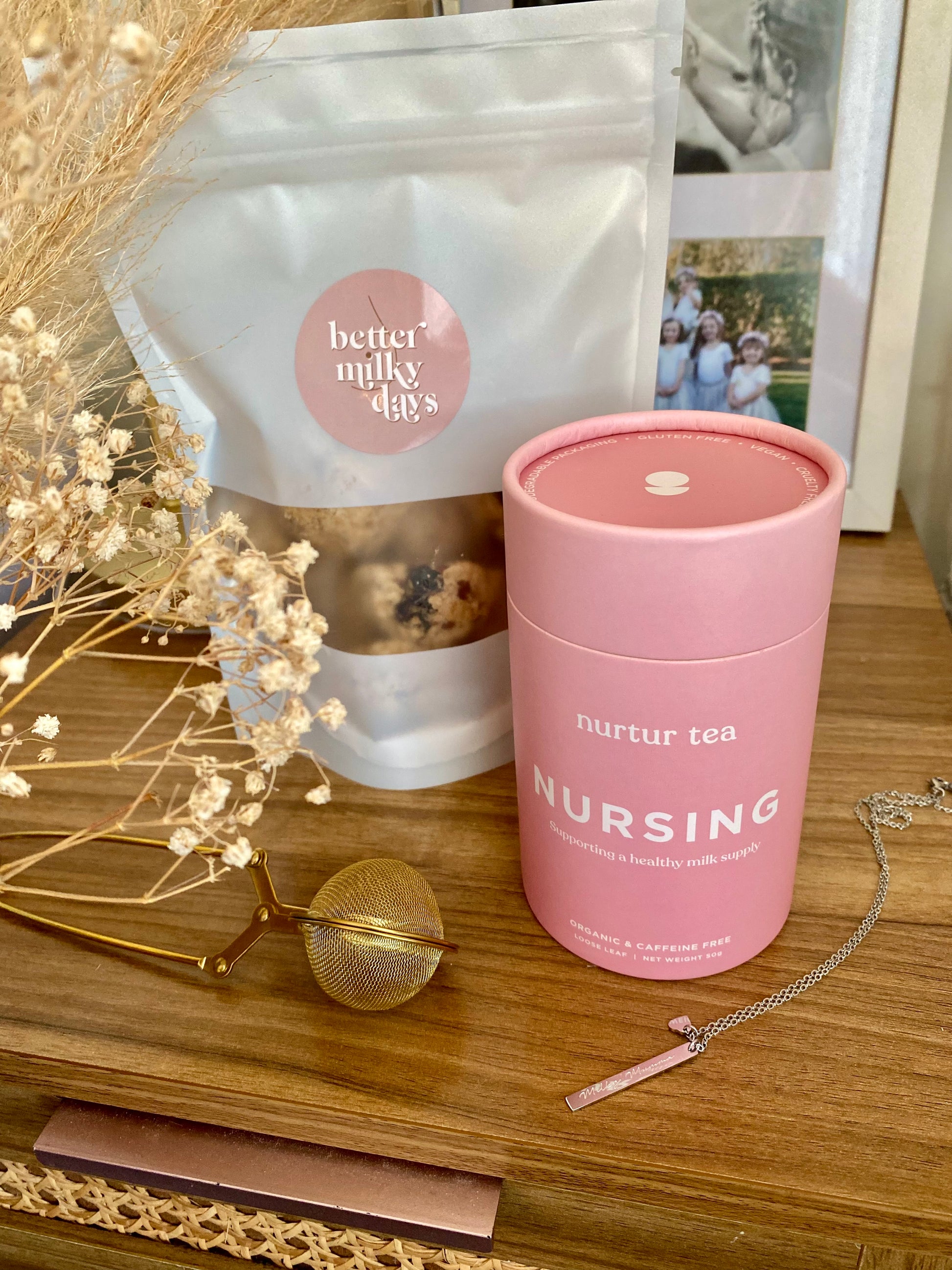 Also included in your Mother’s Day Bundle is a Milky Mumma Necklace and Nurtur Tea Gold Tea Strainer to complete this perfect combination of nourishment and self-care.